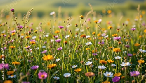 Vibrant Wildflower Meadow Under Soft Morning Light with Green Hills in the Background