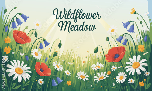 Vibrant Wildflower Meadow with Poppies and Daisies in Sunlight.