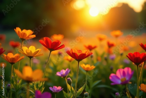 Vibrant wildflowers bathed in golden sunrise light , amazing, texas landscape, flora