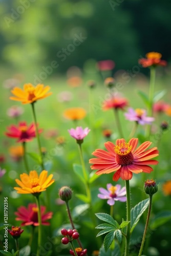 Vibrant wildflowers in a meadow with greenery and berries, meadow flowers, wild herbs, summer elements
