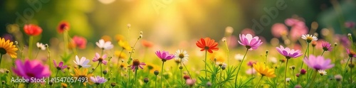 Vibrant wildflowers in full bloom, bathed in the warm sunlight of a beautiful spring day Delicate petals, lush green foliage, a perfect scene of renewal and natural beauty , cheerful, rural