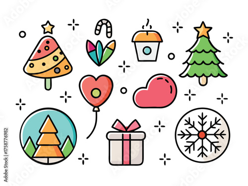 Vibrant Winter Holiday Icons Colorful Christmas Trees Gifts And Snowflake