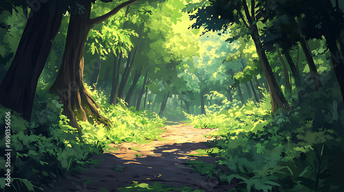 Vibrant woodland pathway glowing with golden morning sunlight high resolution picture