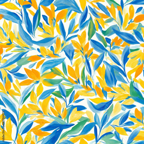 Vibrant yellow and blue leaves create joyful, whimsical floral pattern