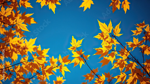 Vibrant yellow and orange autumn leafs on blue background, seasonal change, vibrant