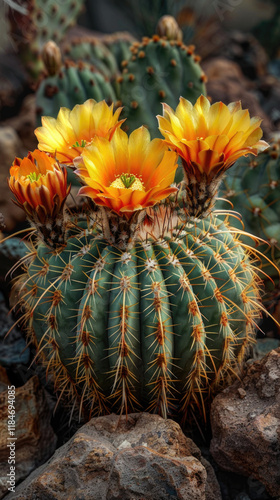Vibrant Yellow and Orange Cactus Flowers Blooming on a Spiky Green Cactus in a Rocky Desert Environment