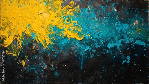 Vibrant yellow and teal brushstrokes on black canvas with glowing light