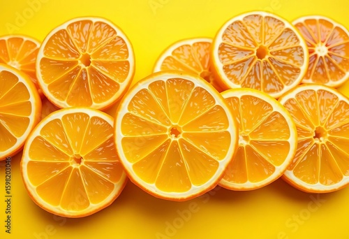 Vibrant yellow background showcases juicy citrus slices, glistening with freshness, delicious, grapefruit