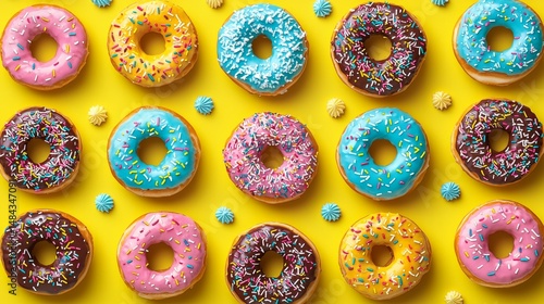 Vibrant Yellow Background with Delightful Donut Pattern - Flat Lay Summer Vibes