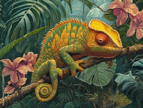 Vibrant Yellow Chameleon in Lush Tropical Rainforest; Exotic Reptile in Jungle Paradise