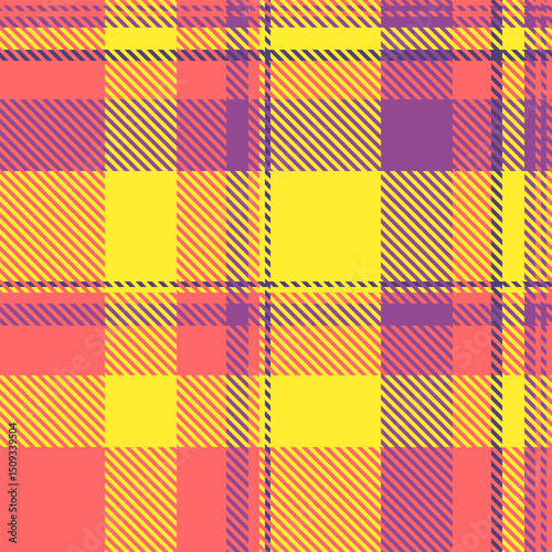 Vibrant yellow, coral, and purple plaid pattern. Perfect for textile design, fashion, websites, or branding. This cheerful, modern texture offers a playful yet sophisticated aesthetic.