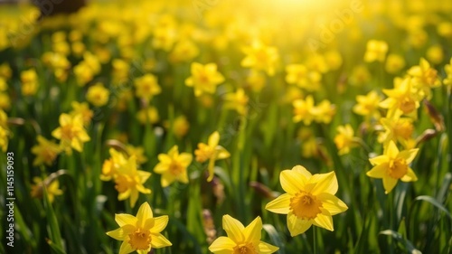Vibrant yellow daffodil flowers blooming in a lush green field under the bright sun, yellow, flowers, nature