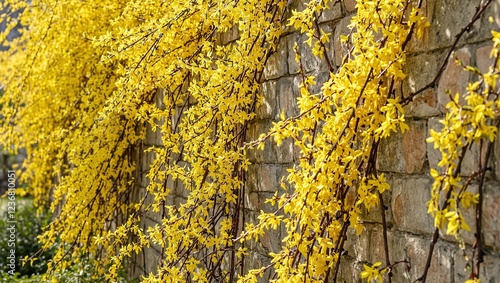 Vibrant yellow forsythia vines against sunlit garden wall