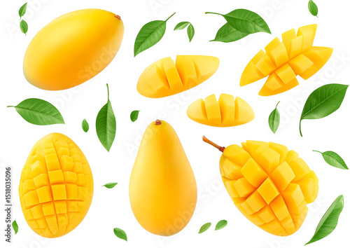 Vibrant yellow mango fruit halves and slices arrangement against a black backdrop