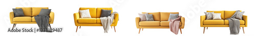 Vibrant yellow sofas with plush cushions and throws in a contemporary minimalist living room design