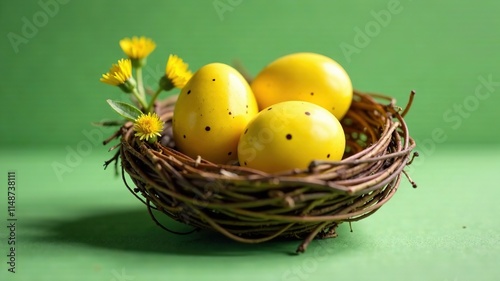 Vibrant Yellow Speckled Eggs in Rustic Nest - Springtime Easter Promotion