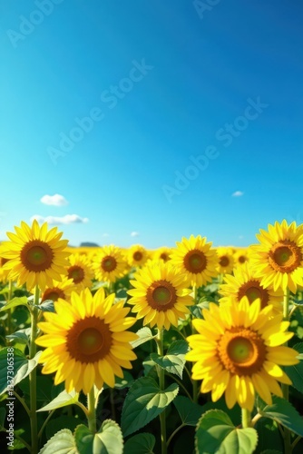 Vibrant yellow sunflowers dominate a vast blue sky field , serenity, yellow