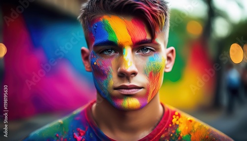 Vibrant Young Man in Multicolored Paint Against a Blurred Background, Embracing the Abstract Expressionism of Digital Artistry