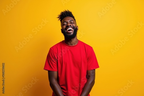 Vibrant Young Man in Red Shirt Laughing Against Yellow Background, Perfect for Advertising, Social Media, and Marketing Campaigns