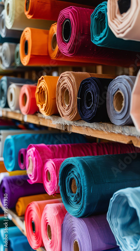 Vibrantly Colored Fabric Rolls Neatly Arranged on Shelves
