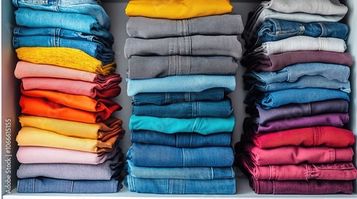 Vibrantly colored folded pants and jeans arranged neatly on a white shelf