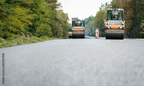 Vibratory asphalt rollers compactor compacting new asphalt pavement. Road service repairs the highway