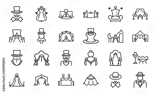 Victorian and Vintage Icon Set – Elegant Clothing, Gentlemen in Top Hats, Luxury Furniture, Royal Curtains, and Classic Event Decorations in Minimal Outline Style