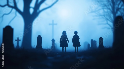 Victorian children playing hide and seek in a foggy graveyard, headstones and creepy trees, moonlight casting eerie shadows, medium shot