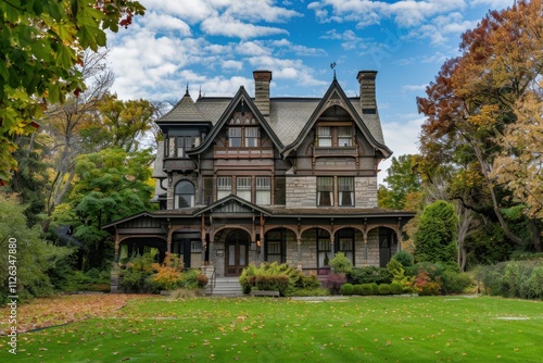Victorian-style red brick mansion surrounded by lush greenery in a suburban neighborhood on a sunny day