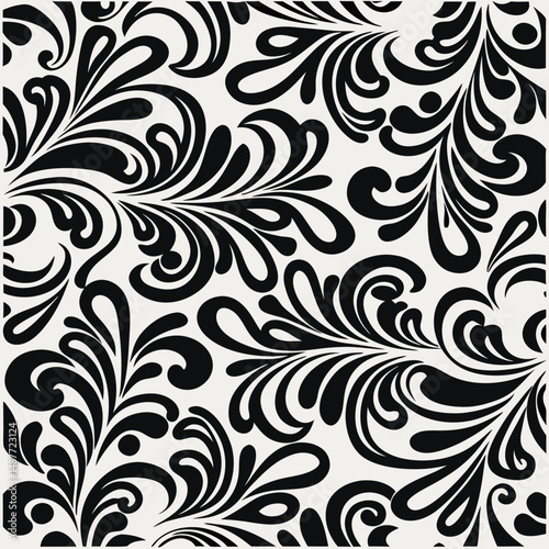 Victorian-style seamless floral pattern. Intricate black floral motifs in a continuous vector layout, ideal for luxury wallpaper or textile design.