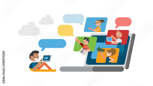 Video conference concept in flat style. Team members discussing project online scene.