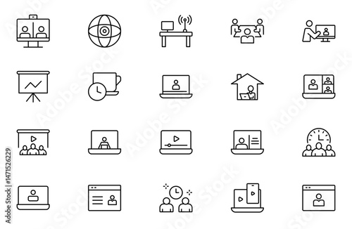Video Conference outline icons set. Live webinar icons for web and mobile app. Containing conference, business meeting, team, interview, conference, Video call. Editable stroke outline icon.
