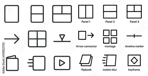 Video editing tools outline icons set – linear, montage, storyboard elements