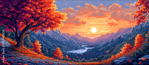 Video game interface background of autumn landscape with mountains at sunset in flat cartoon 8-bit retro style
