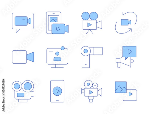 Video icons. Line Duotone style, editable stroke. degree, conference, content, make video, megaphone, smartphone, video camera, video call