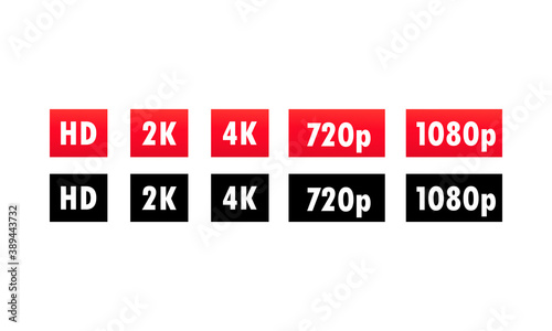 Video quality symbol HD, Full HD, 2K, 4K, 720p, 1080p signs. Screen resolution icons. Vector on isolated white background. EPS 10
