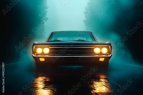 Vieille voiture avec les phares allumés dans la brume dans la forêt