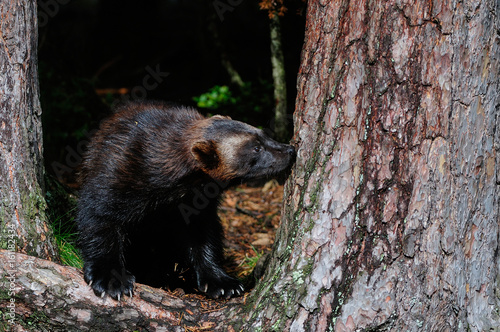 Vielfraß zwischen Kiefern, Schweden