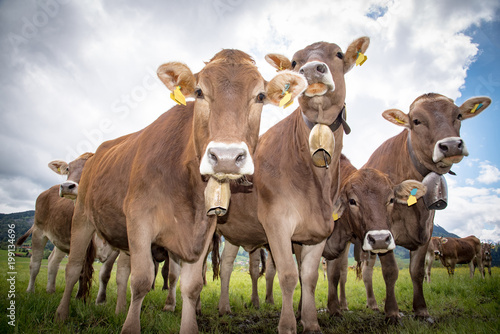 Vier hübsche Braunviehkühe mit Kuhglocke aus der Froschperspektive, Nahaufnahme