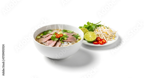 Vietnamese Beef Noodle Soup (Pho Bo) Served with a Side of Fresh Garnishes on a White Background