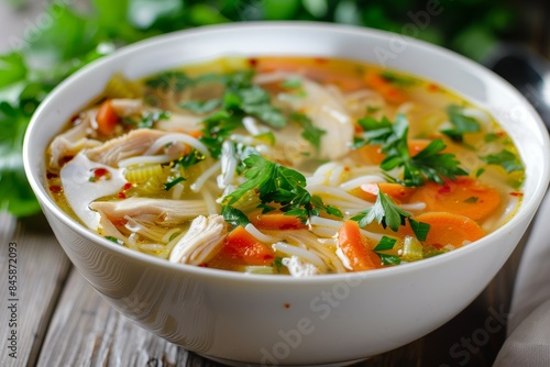Vietnamese chicken soup with traditional spices served with noodles and fresh parsley in a white bowl