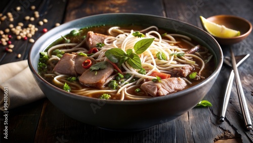 Vietnamese dishes: Pho, a bowl of tempting and delicious Pho on wooden table