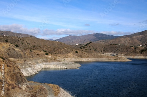 View across La Concepcion reservoir towards the mountains (Embalse del Limonero), Malaga, Spain.
