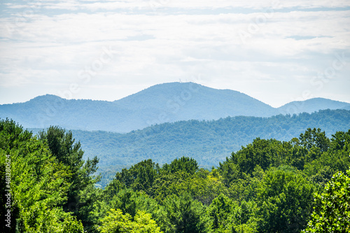 View along road in Afton, Nelson County in Virginia near the Blue Ridge parkway with appalachian mountains in summer, scenic lush foliage landscape and ridges silhouette