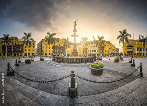 View at the sunset of the antique iron pool of the main square of Lima, Peru.