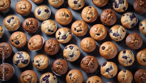 View from above of a variety of different tastes muffins, vhocolate, chips, cocoa, vanilla, nuts, isced sugar, cream ones, aerial view