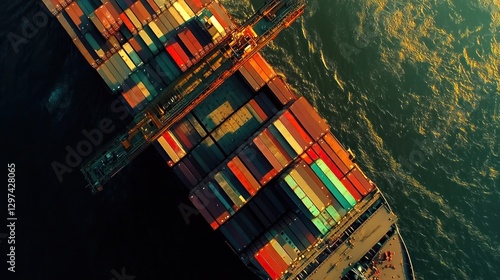 View from above of cargo ship with containers sailing on the high seas, industrial port area in the background of container ships at the pier or approaching the meeting point at sea