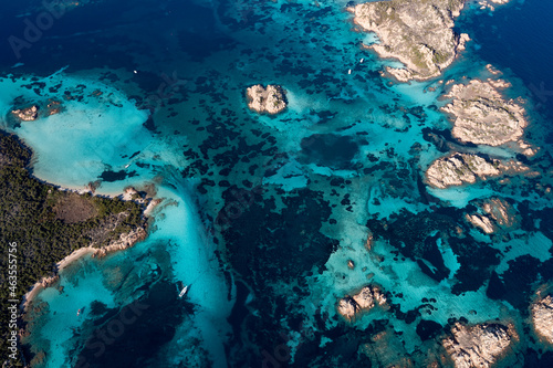 View from above, stunning aerial view of La Maddalena archipelago with some islands bathed by a turquoise and clear waters. Sardinia, Italy.
