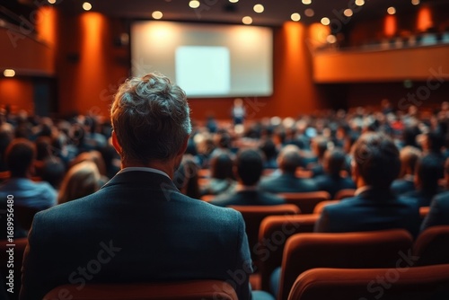 View from behind a gray-haired man in a suit attending a crowded conference or lecture in a large auditorium with warm lighting and a speaker presenting on a screen