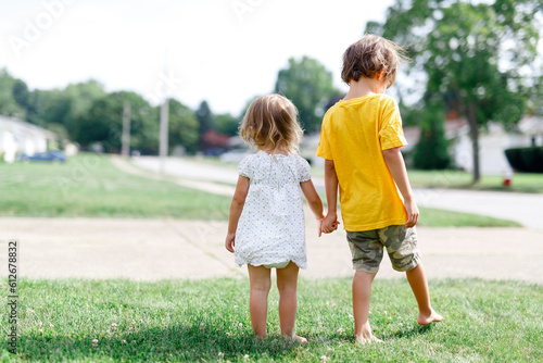 View from behind of siblings holding hands